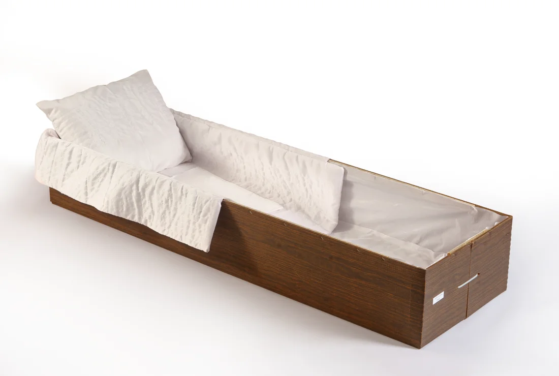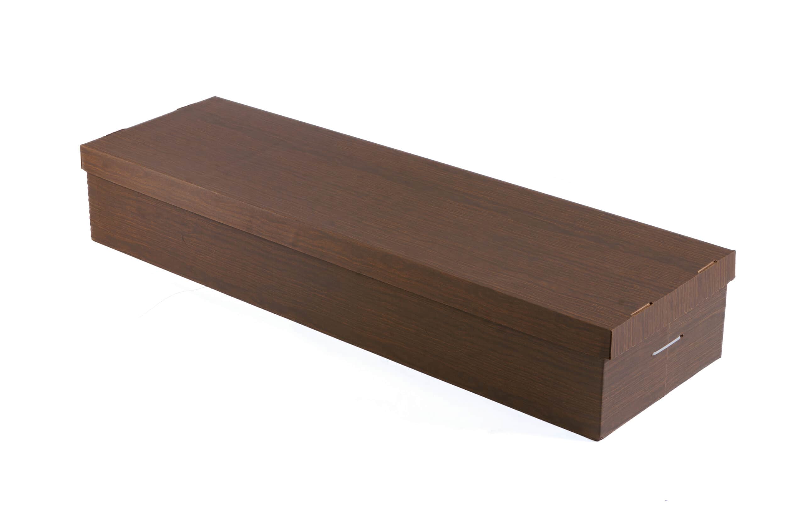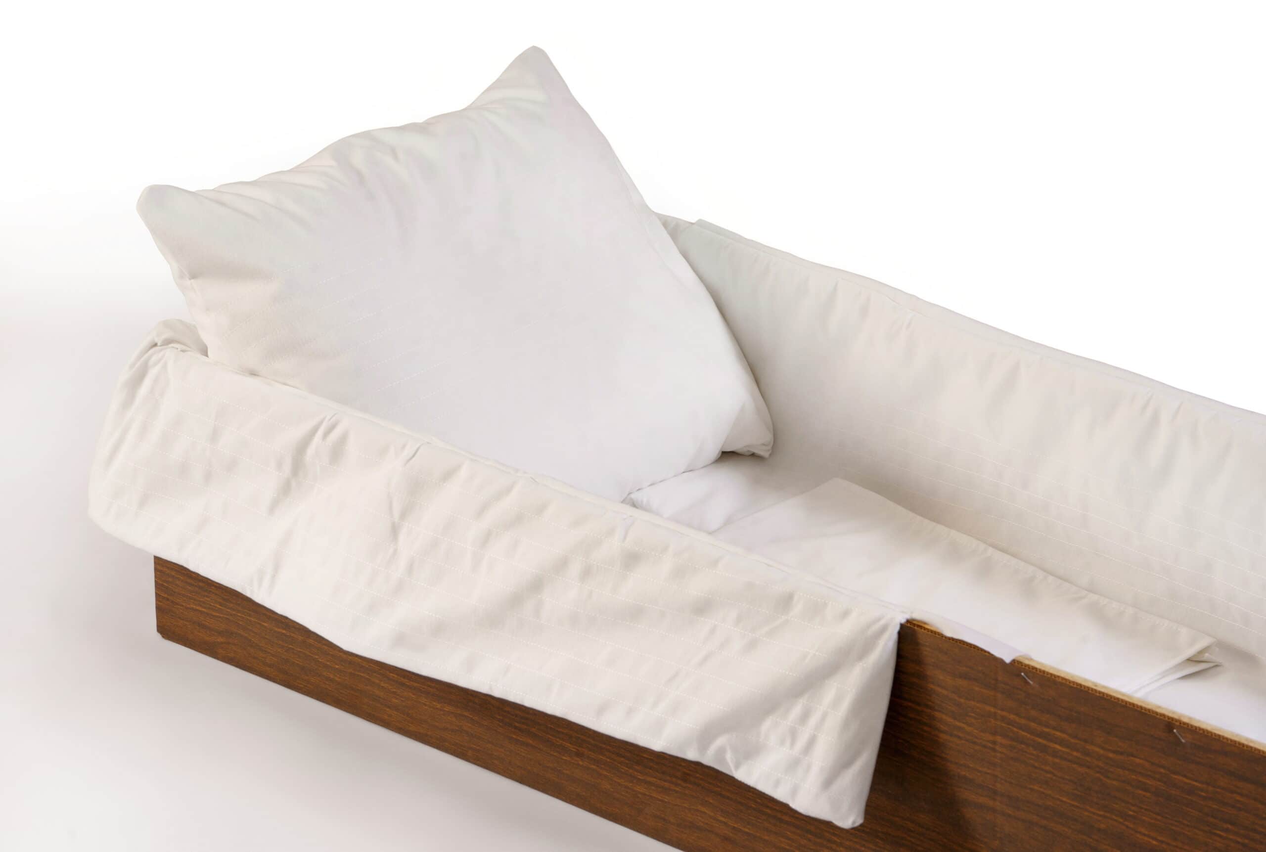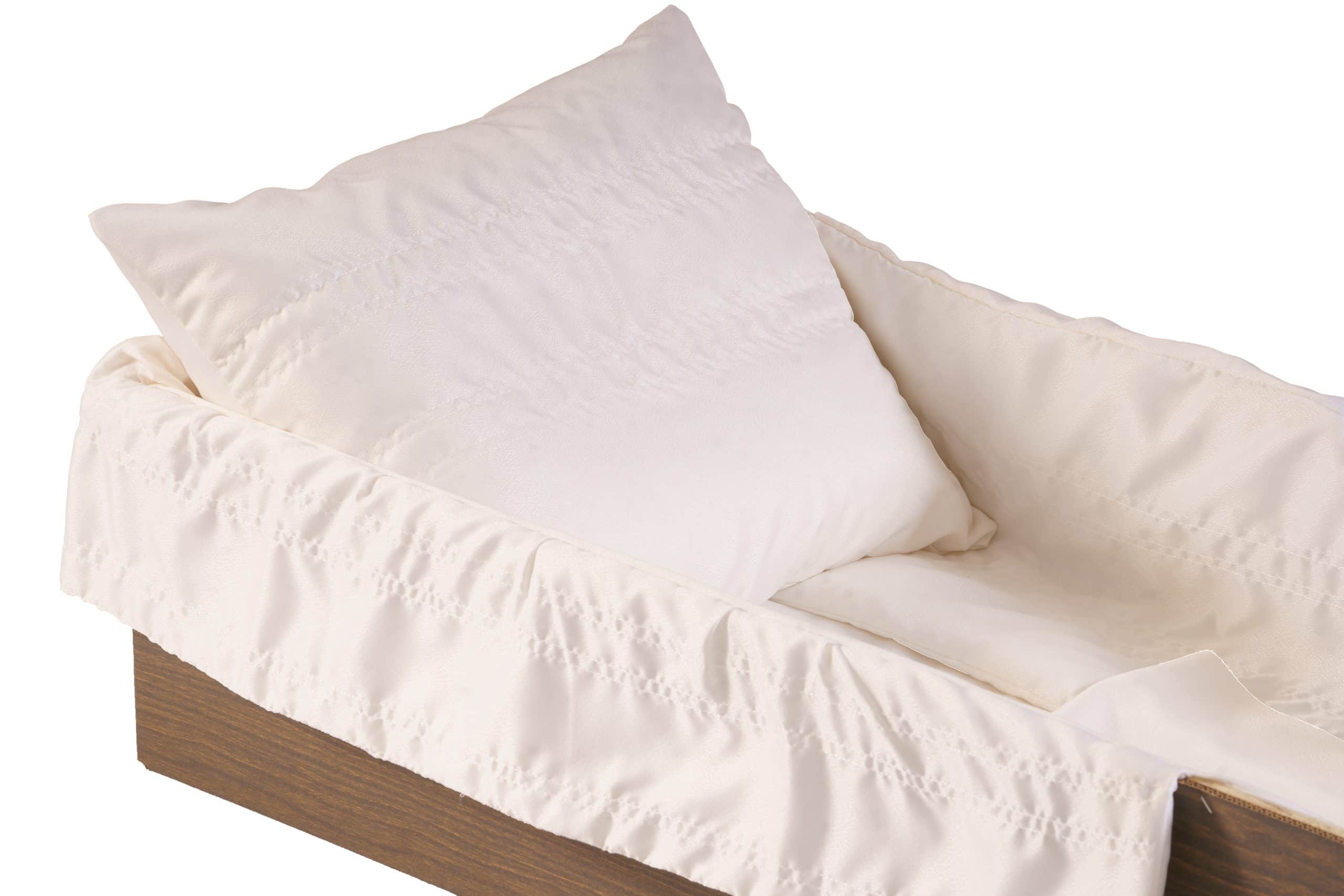 Our fabric team, with over 25 years in experience, specializes in sewing for funeral industry. Each insert is also constructed out of double-walled cardboard with a sleek wood-grain exterior finish. This combination of durability and professional aesthetics guarantees a dignified setting for families and friends to see their loved one.