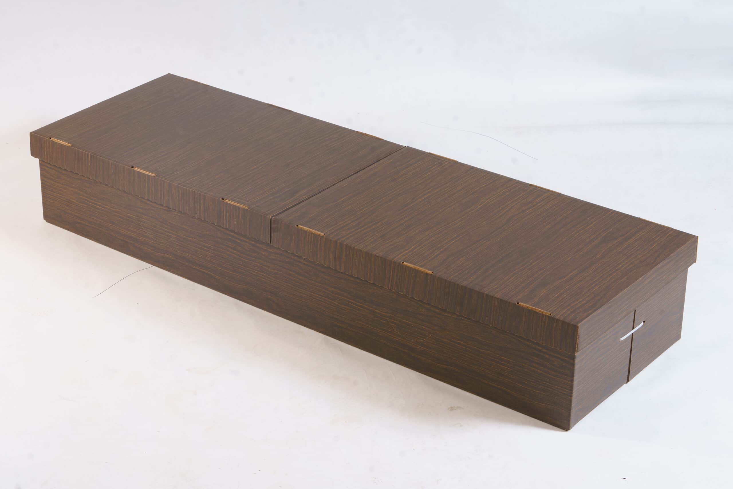 The Split Lid Viewer is a practical, cost-efficient alternative to rental caskets. Crafted with a wood grain exterior design, it offers a professional appearance while the double wall cardboard provides sturdy construction. It features a high-quality crepe fabric interior without stitching patterns, providing a tailored look. Concealed within is a plastic liner for leak resistance, discreetly shielded by the fabric.
