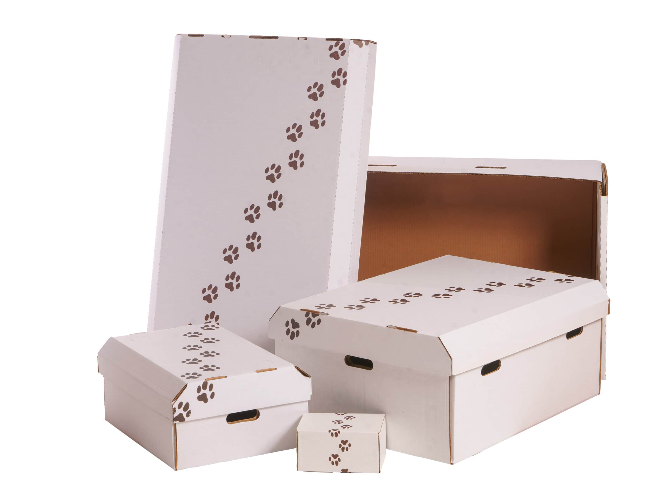 Crafted with care, this compact box offers a solution for transporting injured, sick, or deceased pets. Each box features a supportive piece of cardboard at the bottom to ensure structural integrity. Printed with a paw print design, give your customers a professional looking box to cater to their pet’s needs.